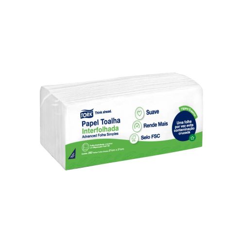 O papel toalha interfolhado Tork Advanced possui folhas simples e vêm com 16 pacotes de 260 folhas cada, tem a resistência e maciez de um produto Advanced de fibra virgem.