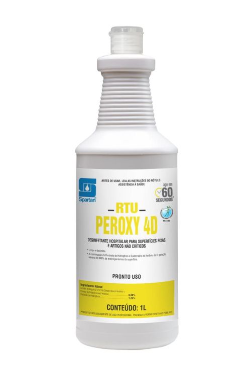 RTU Peroxy 4D é ideal para limpeza e desinfecção de Superfícies Fixas, como: Piso (sem acabamento acrílico), parede, teto, portas, bancadas, escadas, janelas, vidros, luminárias, equipamentos, mobiliários, louças sanitárias, macas, incubadoras etc. e Artigos Não Críticos, como: Termômetro axilar, estetoscópio, suporte de soro, aparelhos de pressão, comadres, papagaios, bacias, cuba rim, cadeiras de banho, etc.